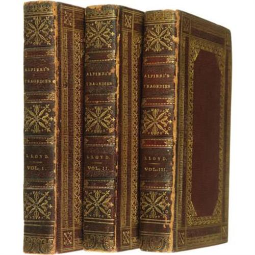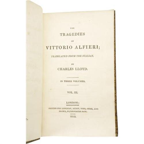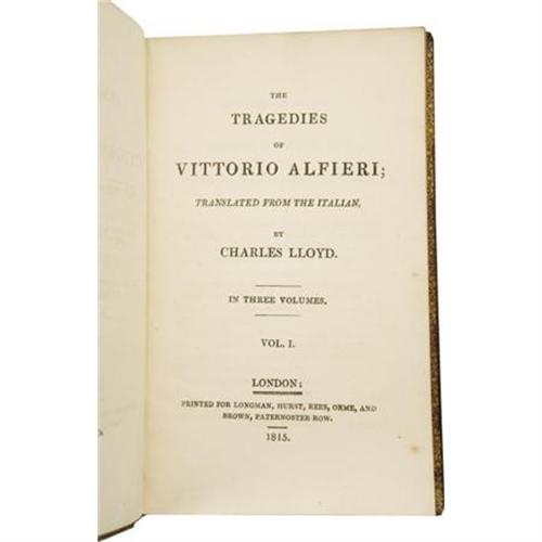 <B>Charles Lloyd Translator : </B></I><B><I>The Tragedies of Vittorio Alfieri</B></I></B></I> <I>in Three Volumes</B></I>. (London: Printed for Longman, Hurst, Rees, Orme, and Brown by James Ballantyne & Co. of Edinburgh, 1815), first edition, 365, 371, 413 pages, elaborately tooled leather with gilt, half-titles present, all edges gilt, 16mo (4" x 6.5"). Vittorio Alfieri (1749-1803) was an Italian dramatist and is considered the founder of Italian tragedy. Charles Lloyd (1775-1839) was a poet and writer and a friend of both Samuel Coleridge Taylor and Charles Lamb. In 1811, he started exhibiting signs of mental instability with pronounced epileptic attacks. It is said that he undertook the Alfieri translations as a means of diverting his mind from these problems. Very good condition with tight text blocks and strong (but somewhat rubbed) hinges, some corner bumps. A nice set.<BR><BR><b>Shipping:</b> Books & Catalogs (<a target="_blank" href="http://www.heritageauctions.com/common/shipping.php">view shipping information</a>)