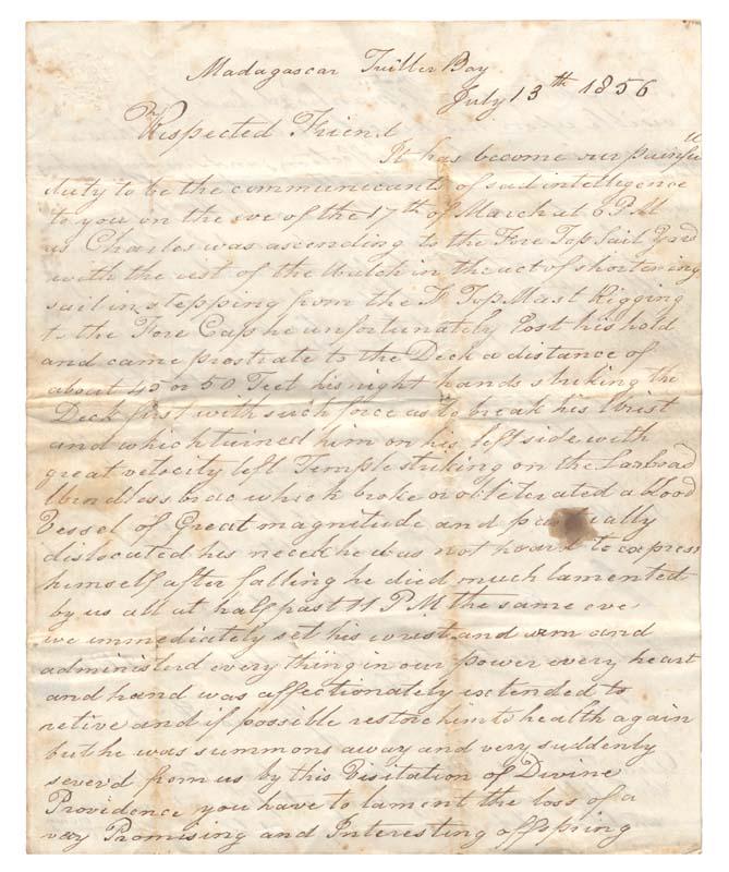 Autograph Letter Signed, “ James Irish.” Two pages, 7” x 8 3/4”. Madagascar, Tuiller [sic] Bay. July 13, 1856. The letter reads, in part: “ … It has become our principle duty to be the communicants of sad intelligence to you, on the 17th of March at 6 pm Charles was ascending to the Fore Top Sail Yard with the rest of the watch in the act of shortening sail in stepping from the F. Top Mast Rigging to the Fore Caps he unfortunately lost his hold and came prostrate to the deck a distance of about 45 or 50 feet his right hands striking the Deck first with such forces as to break his wrist and which turned him on his left side with great velocity left temple striking … which broke or obliterated a blood vessel of great magnitude and partially dislocated his neck. He was not heard to express himself after falling he died much lamented by us all … we immediately set his wrist and arm and administered every thing in our power every heart and hand was affectionately extended to relieve and if possible restore him to health again but he was summons [sic] away and very suddenly … you have to lament the loss of a very Promising and interesting offspring before the years of mature manhood had become visible upon his peaceful brow …” One the third page the following lines have been penned by our author: “Ten thousand dangers float around \ to waft us to the Tomb \ Each in a hour can bring us down \ Where hope will never come.” A couple of pinholes at intersection of fold. Some light soiling. Overall Fine.