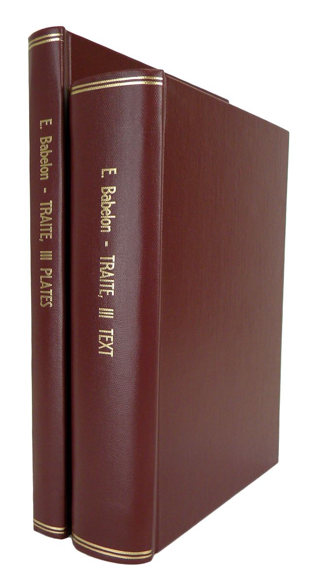 Babelon, Ernest. TRAITÉ DES MONNAIES GRECQUES ET ROMAINES. DEUXIÈME PARTIE: DESCRIPTION HISTORIQUE. TOME TROISIÈME: COMPRENANT LES MONNAIES DE LA GRÈCE CENTRALE ET MÉRIDIONALE AUX Ve ET IVe SIÈCLES AVANT J.-C. Paris: Ernest Leroux, 1914. vi, (2) pages; 1144 double columns [572 pages]; a few text figures. [with] TROISIÈME PARTIE: ALBUM DES PLANCHES. PLANCHES CLXXXVI À CCLXX. Unidentified reproduction of the 1916 original. (4) pages; 6, (2) double columns [4 pages]; 85 well-done reproductions of the original plates of coins. Two volumes. 8vo [differing sizes, as issued], later matching maroon cloth, gilt. Near fine. See catalogue for full description.