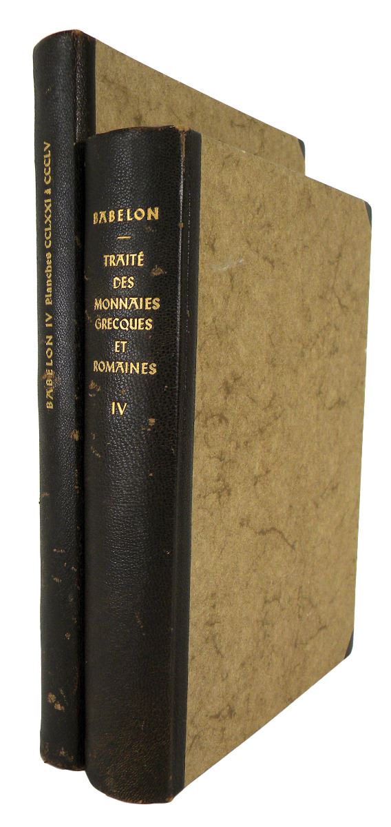 Babelon, Ernest. TRAITÉ DES MONNAIES GRECQUES ET ROMAINES. DEUXIÈME PARTIE: DESCRIPTION HISTORIQUE. TOME QUATRIÈME: COMPRENANT LES MONNAIES DE LA GRÈCE SEPTENTRIONALE AUX VE ET IVE SIÈCLES AVANT J.-C. Paris: Ernest Leroux, 1926. iv pages; 1100 double columns [550 pages]. [with] ALBUM DES PLANCHES. PLANCHES CCLXXI À CCCLV. Paris: Ernest Leroux, 1926. 85 very fine plates of coins. Two volumes. 8vo [differing sizes, as issued], somewhat later matching brown morocco and decorative boards; spines lettered in gilt; original printed front card covers bound in. Near fine. See catalogue for full description.