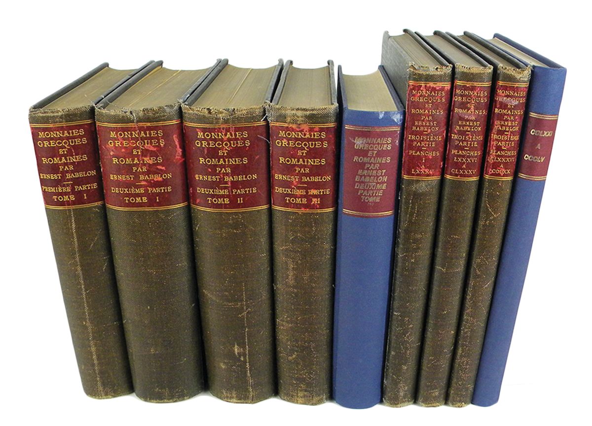 Babelon, Ernest. TRAITÉ DES MONNAIES GRECQUES ET ROMAINES. Paris: Ernest Leroux, 1901-32. Five text volumes and four plate volumes, complete. [...] 4to [plates taller than text], mostly in matching contemporary blue cloth; red morocco spine labels, gilt. Final volume of text and plates in modern bindings resembling others, with rounded corners. Bindings moderately worn from use; third text volume with cracked front hinge; very good or better. Of the highest importance. Clain-Stefanelli, in Numismatics--An Ancient Science, heaps praise on Babelon and his many authoritative works on Greek numismatics, calling the Traité "his greatest work." Sets are infrequently offered. These volumes are all that Babelon published, with Jacques de Morgan publishing two additional volumes (vide infra) on Persian coins after Babelon's death. Described in a 1935 Alfred Page numismatic book catalogue as an "ouvrage extrêmement rare et d'une documentation exceptionelle. -- Les premiers volumes, complètement épuisés, sont introuvables." Clain-Stefanelli 1809*: "An unfinished but monumental work, indispensable for the scholar." Daehn 19. Grierson 52. [Online description truncated: see printed or PDF catalogue for full description.]