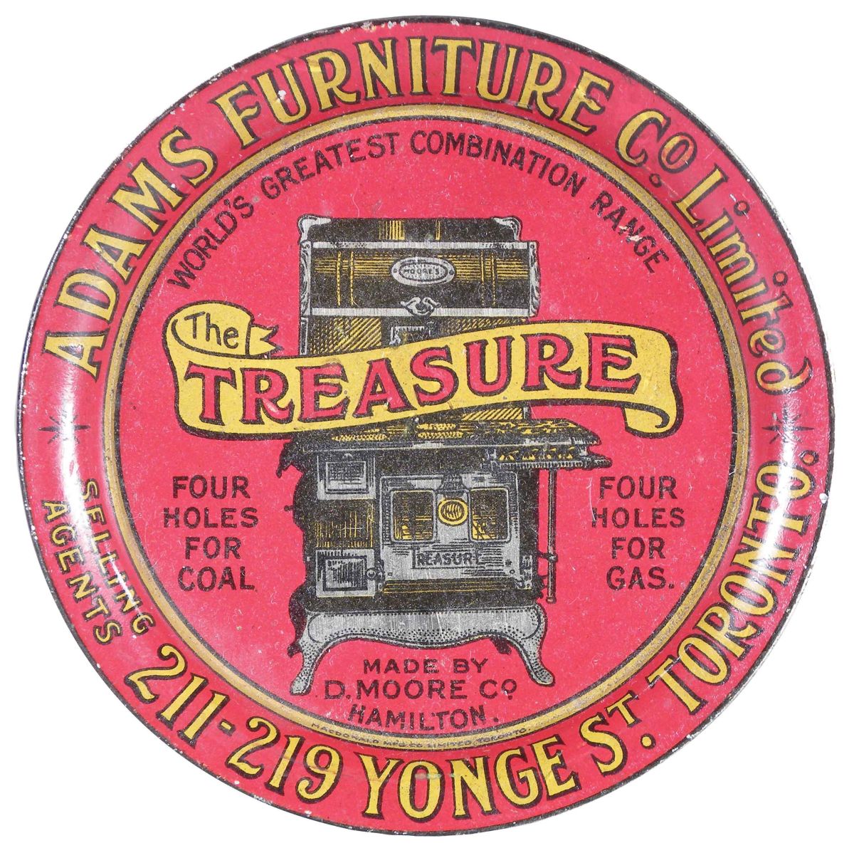 The Treasure Cook Stove Tin Tip Tray. Adams Furniture Co. Ltd, Toronto. Very good condition. 4 1/4 inch diameter. Start Price $20