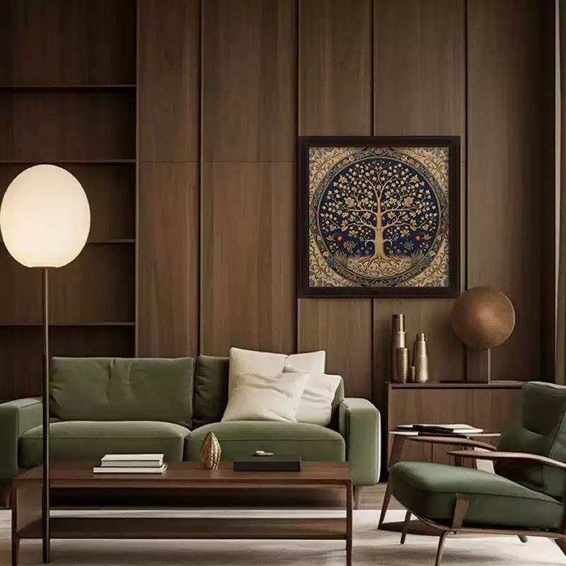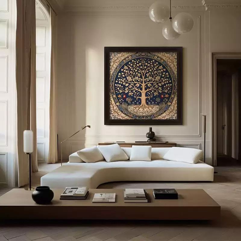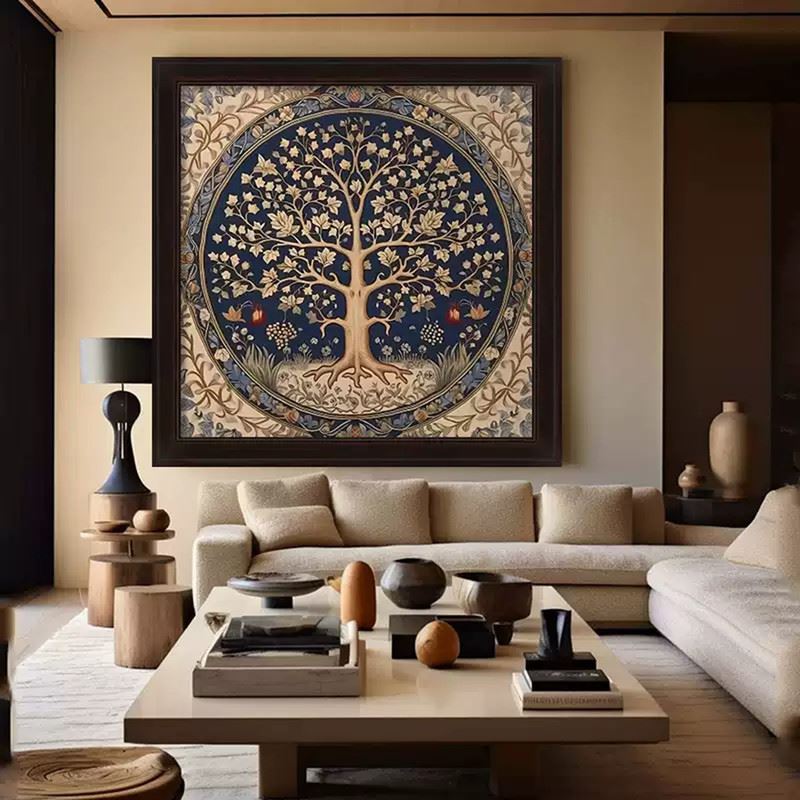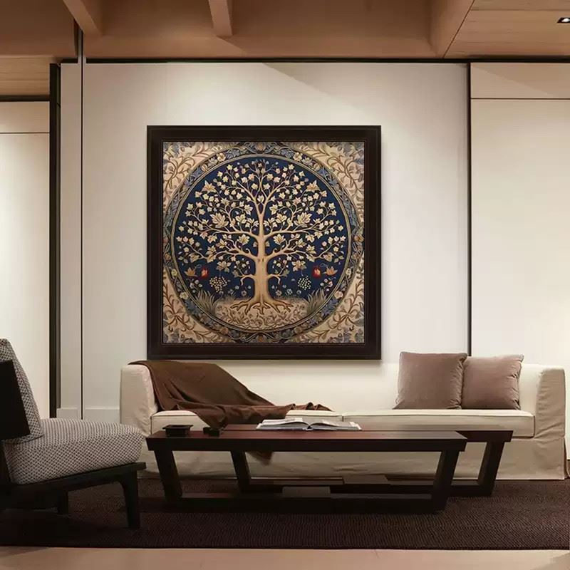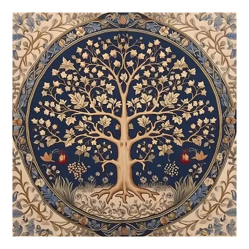 This artwork depicts a tree symbolizing life and prosperity, surrounded by flowers and fruits that add vitality to nature. The delicate lines and deep blue background complement each other, showcasing the beauty of balance and harmony. Dimensions: 28 x 28 inches.