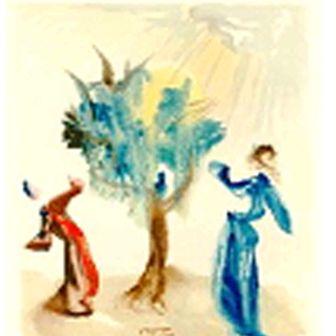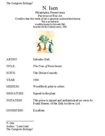 This is an authentic woodblock print in color by Salvador Dali from the Divine Comedy series, 1964 Authenticated on verso, by Frank Hunter, of the Salvador Dali Archives, Ltd. Signed in the plate.