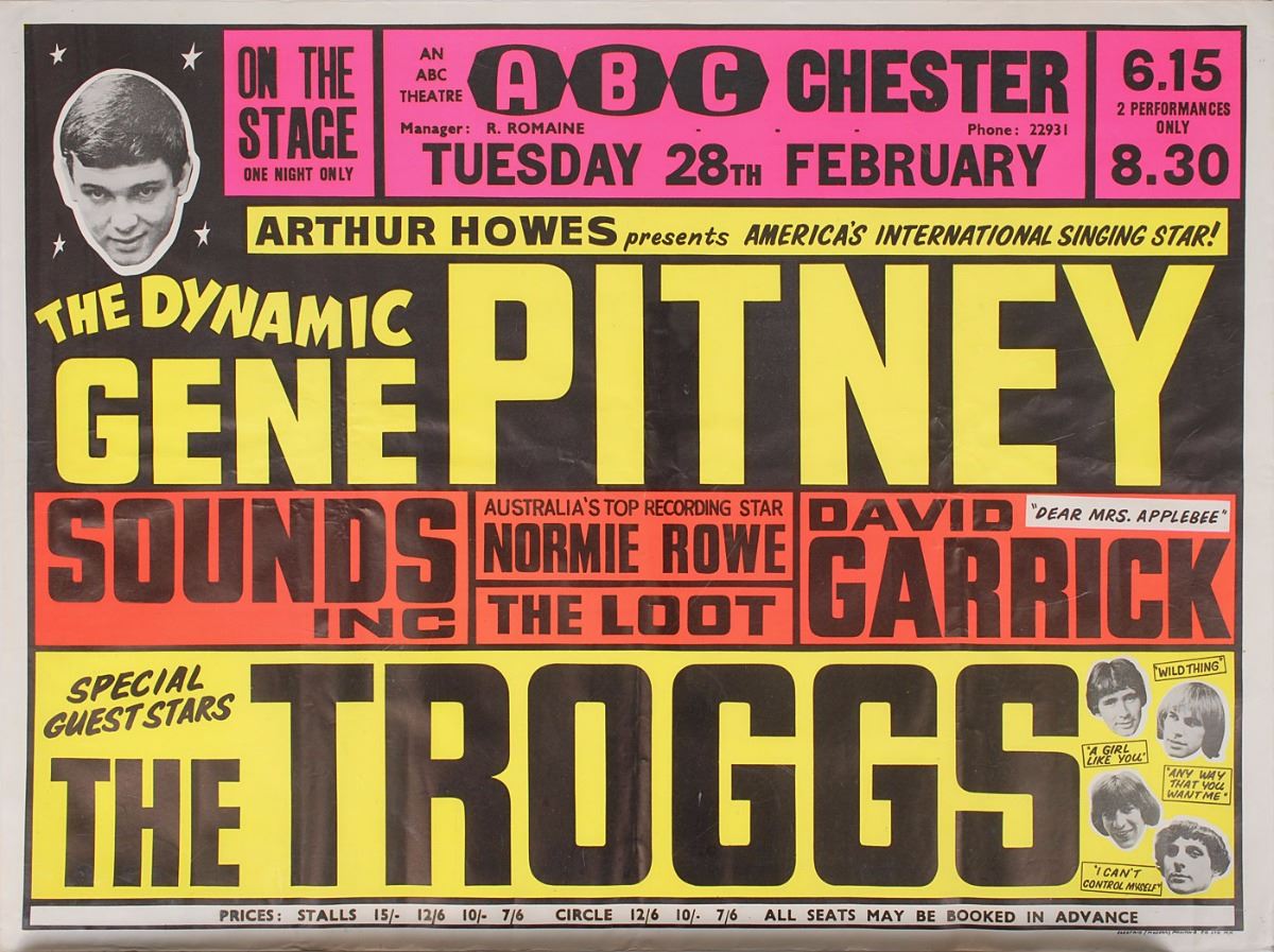 Color 40 x 30 UK concert poster for Gene Pitney and The Troggs at the ABC Theatre, Chester, on February 28, 1967. Also on the bill were Sounds Incorporated, The Loot, Normie Rowe and David Garrick. Rolled and in very good to fine condition, with scattered creasing; the bright neon colors remain exceptionally vibrant. Accompanied by a certificate of authenticity from Tracks.