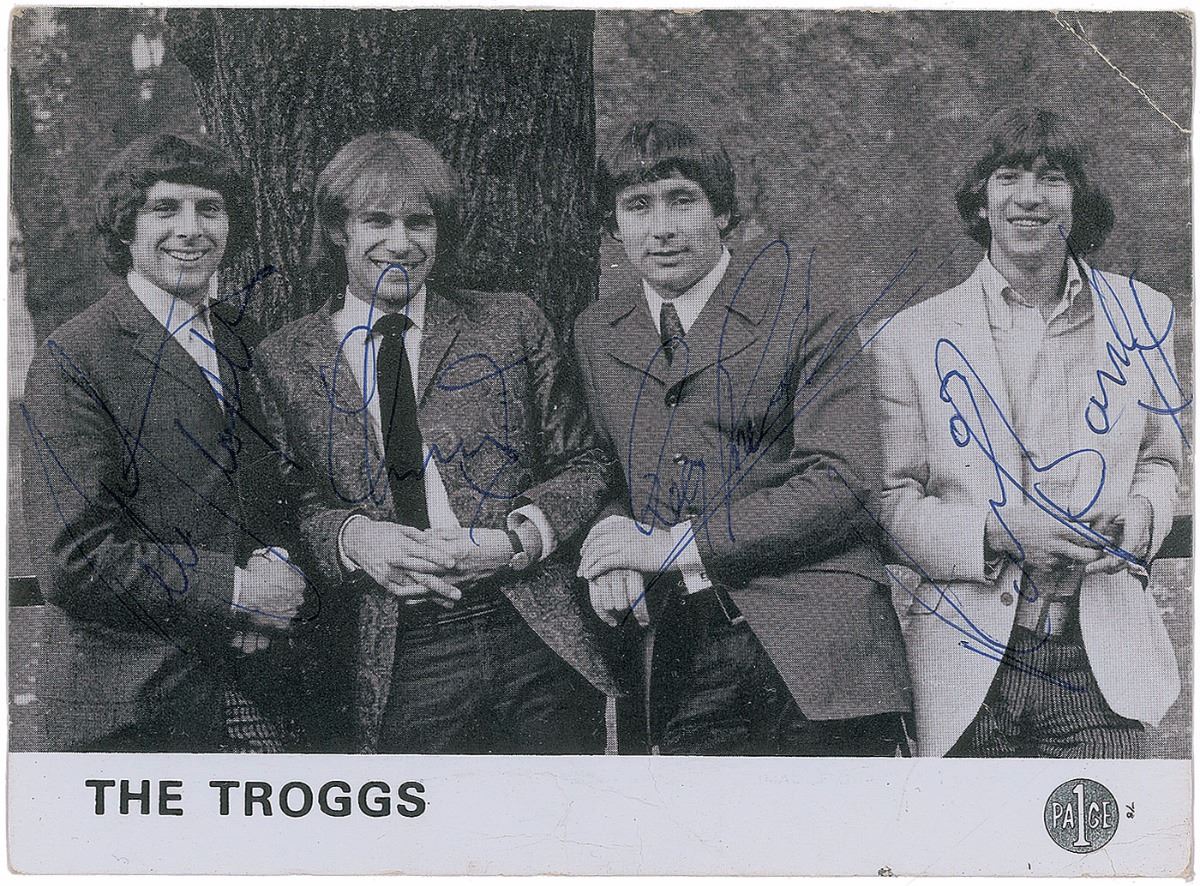 Page One Records Limited 6 x 4.5 fan club promo card featuring an image of the Troggs posing besides a tree trunk, signed on the front in blue ballpoint by Reg Presley, Chris Britton, Ronnie Bond, and Pete Staples, who adds a note on the reverse, “Dear David, We are on the tele on the next ‘Countdown’ show. Thank you for your letter, Pete Staples.” Slight scattered creasing and edgewear, and fair contrast to the front Staples signature against his dark suit, otherwise fine condition.