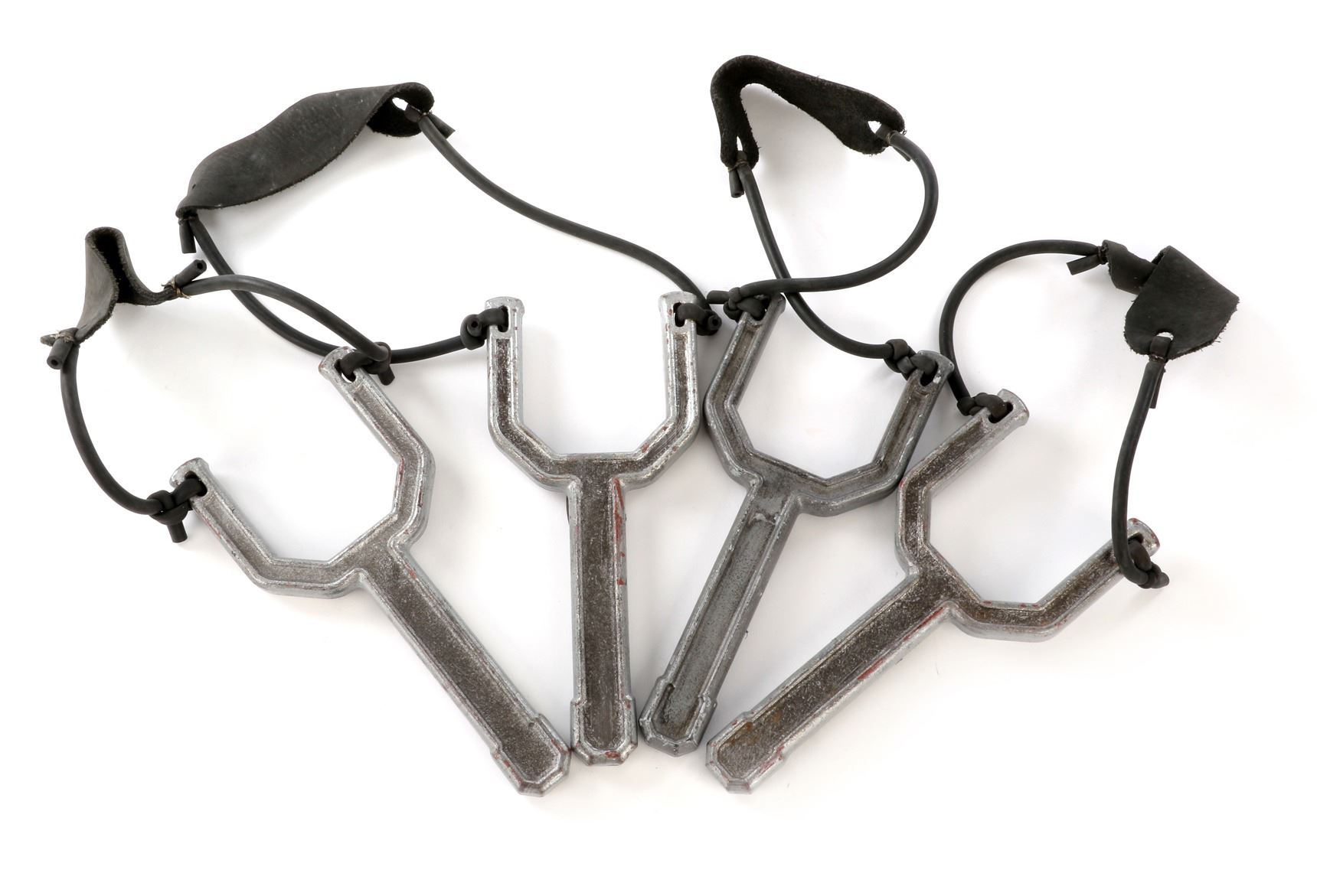 "114. The Trosts of Wendimoor" slingshots from Dirk Gently's Holistic Detective Agency. (BBC America, 2016-2017) Collection of (4) Trost clan slingshots constructed of cast resin expertly studio painted to resemble metal with rubber hoses and black leather pockets. Each measures 4.25 x 8.3 x 1 in. A signature weapon of Wendimoor, slingshots prove their lethality in the battle of the bridge. Some paint chipping and production wear. In generally very good condition. Starting Bid: $25