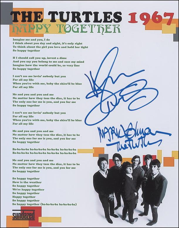 Color glossy 11 x 14 photo of the lyrics to ‘Happy Together,’ signed in blue felt tip by Howard Kaylan and Mark Volman, the latter adding “The Turtles.” In very fine condition.
