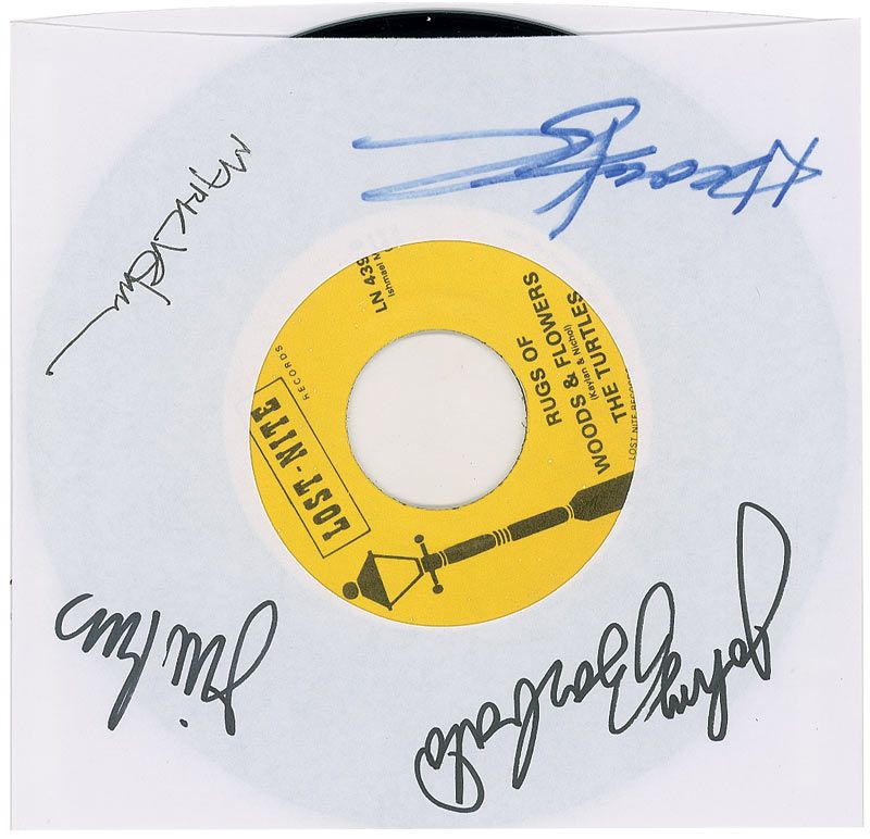 45 rpm record for the single ‘She’d Rather Be with Me/Rugs of Woods & Flowers,’ signed on the sleeve in black felt tip by Johny Barbata and Jim Pons, signed in blue felt tip by Howard Kaylan, and signed in black ballpoint by Mark Volman. In fine condition.