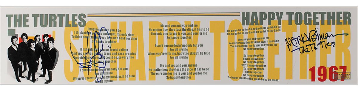 Color satin-finish 30 x 6 photo of the printed lyrics to ‘Happy Together,’ signed in blue felt tip by Mark Volman and Howard Kaylan. In fine condition.