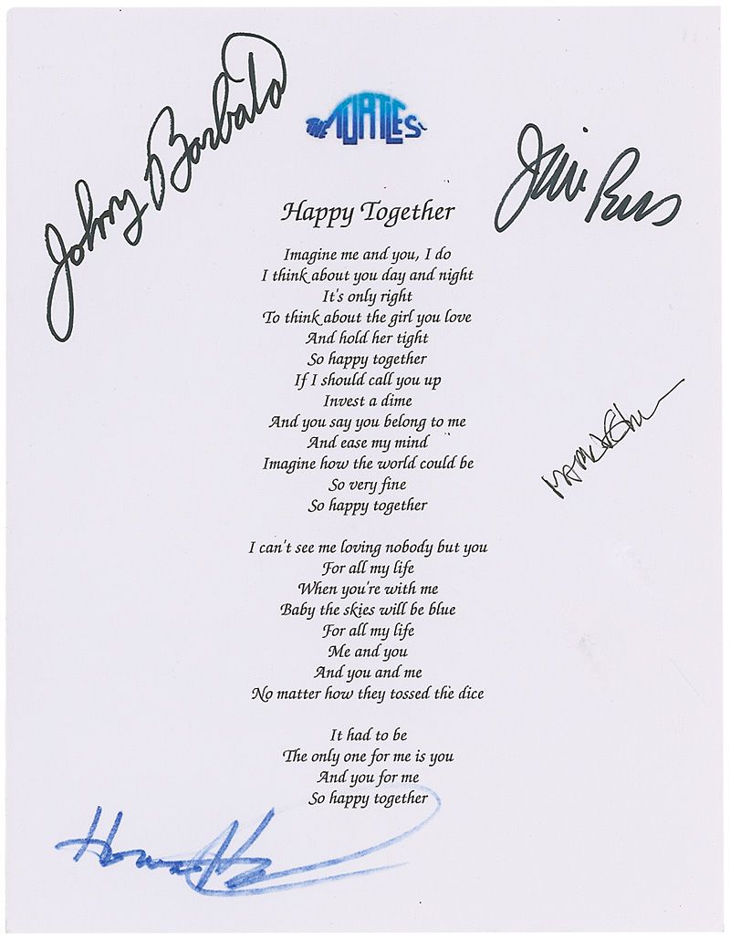 Souvenir printed lyrics to ‘Happy Together,’ on an off-white 8.5 x 11 sheet, signed in blue and black felt tip by Howard Kaylan, Mark Volman, Jim Pons, and John Barbata. In fine condition, with some creasing to corner tips.