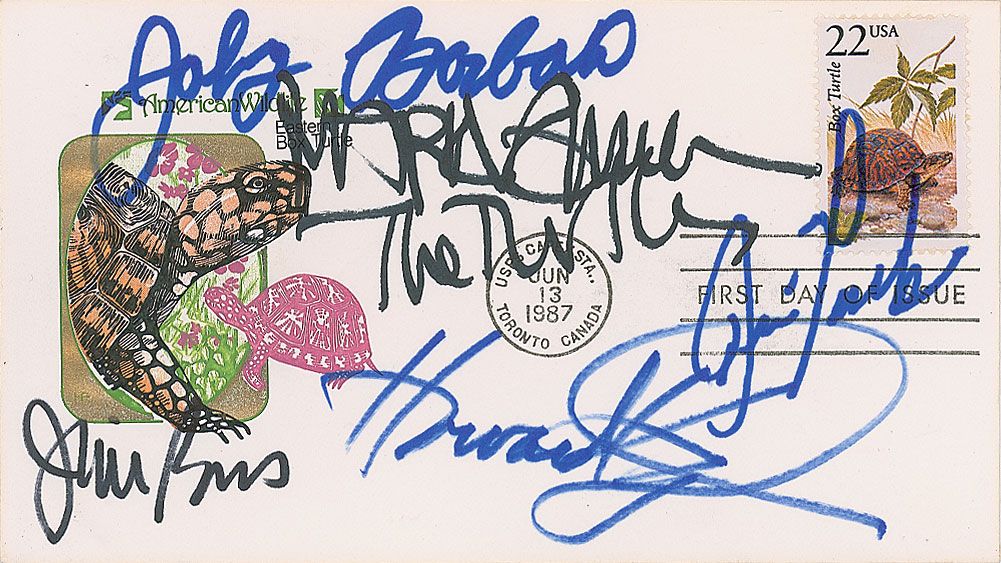 FDC with a cachet honoring the Eastern Box Turtle, signed in blue and black felt tip by Mark Volman, Howard Kaylan, Jim Pons, Johnny Barbata, and Jim Tucker. In fine condition.