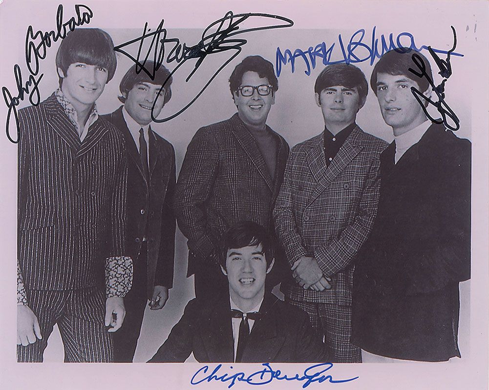 Glossy 10 x 8 group photo, signed in blue and black felt tip by Howard Kaylan, Mark Volman, John Barbata, Jim Tucker, and Chip Douglas. In fine condition, with a ding to the upper left corner tip.