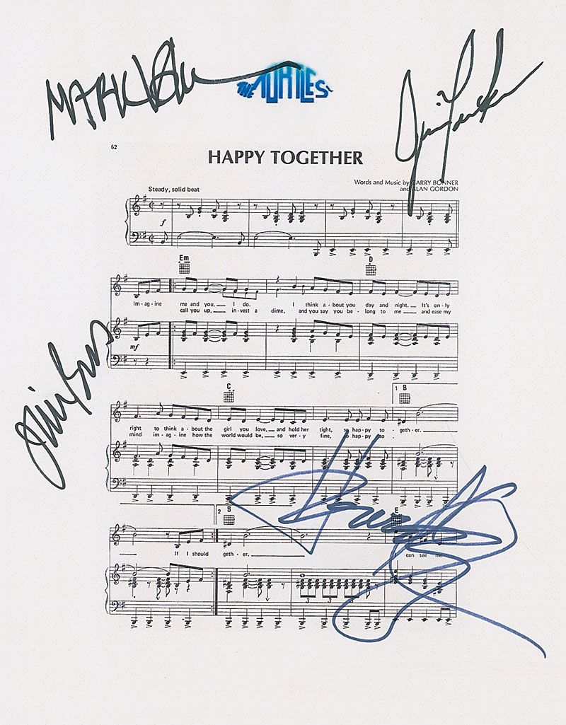 Souvenir printed sheet music to ‘Happy Together,’ on a white 8.5 x 11 sheet, signed in blue and black felt tip by Howard Kaylan, Mark Volman, Jim Pons, and Jim Tucker. In fine condition.