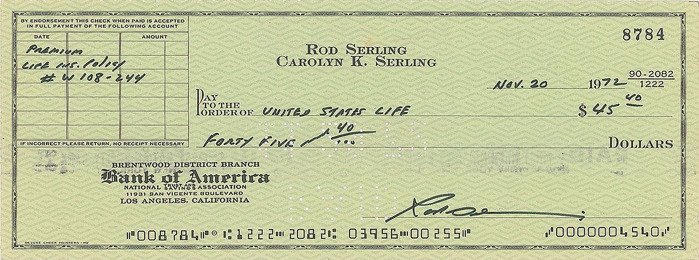 Personal check, 8.25 x 3, filled out and signed by Serling, payable to United States Life for $45.40, November 20, 1972. In fine condition.
