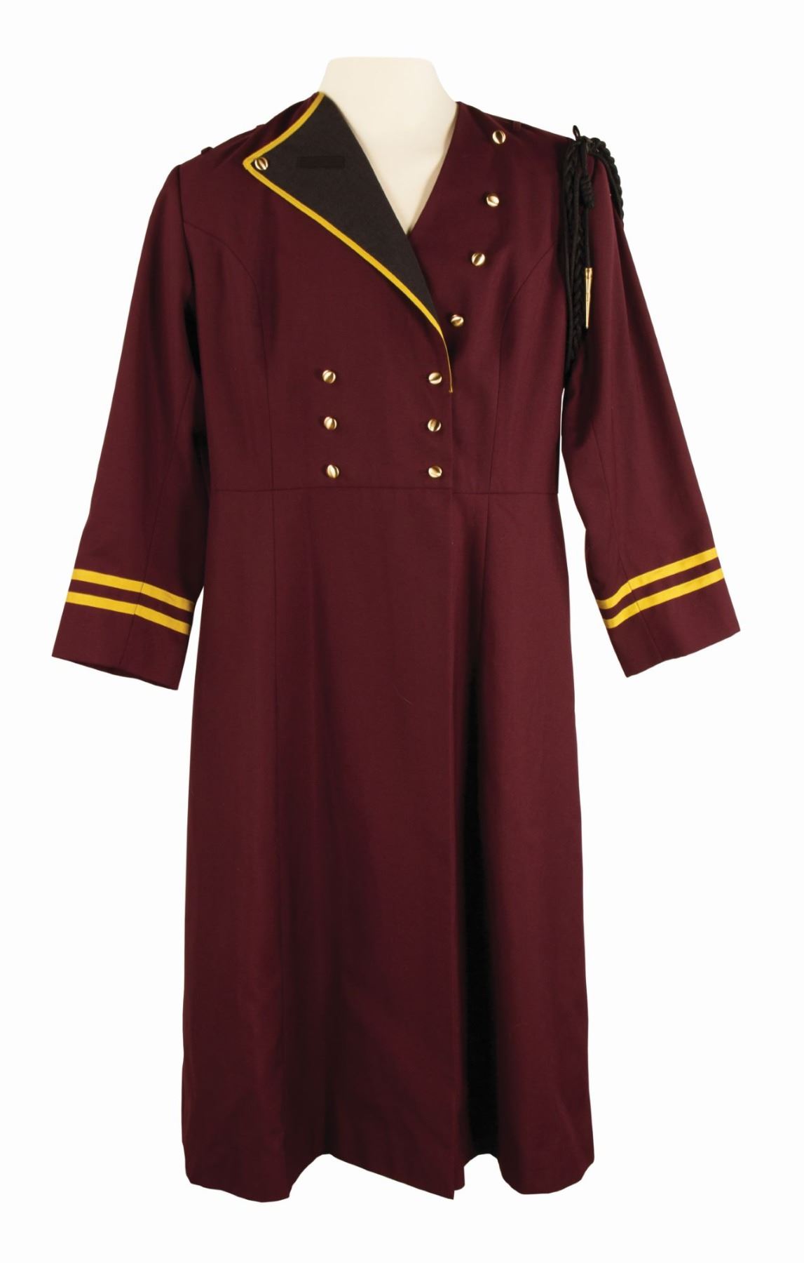 (Disney-MGM, c.2000s) A very rare female cast member coat from The Twilight Zone Tower of Terror attraction at Disney-MGM Studios in Walt Disney World. This iconic long coat features the stylish red and gold color scheme that has become a very memorable aspect of the attraction. Although the coat does not have the braided epaulettes on the shoulders, it does come with the aiguillette. The coat still retains its original Disney wardrobe tag and is marked size 24. This item is in very good condition with minor wear from use.
