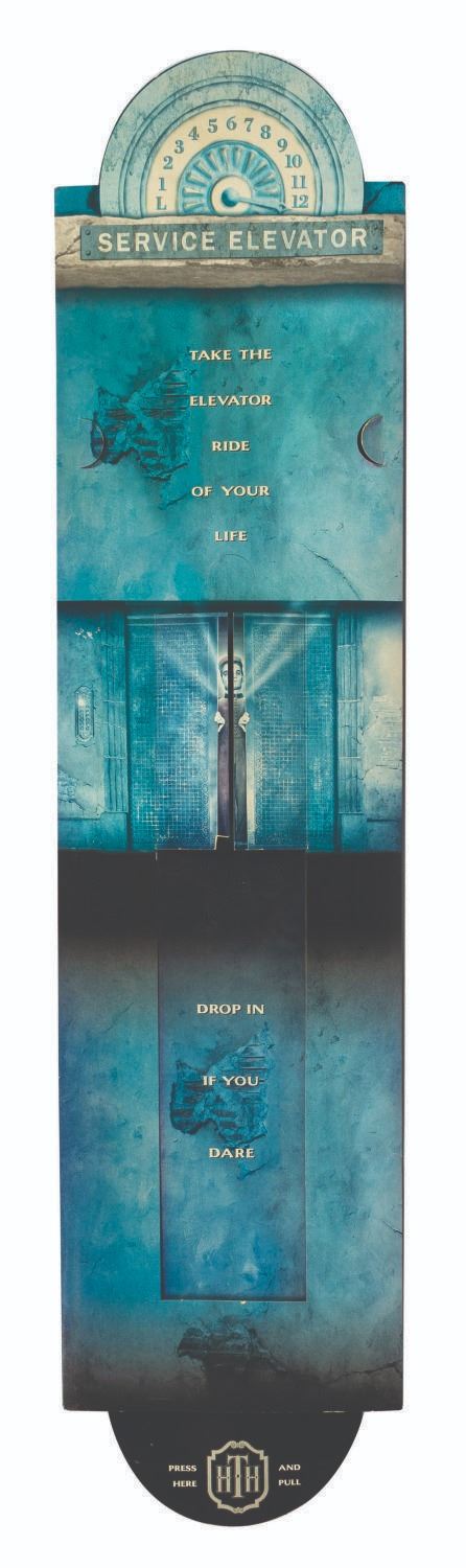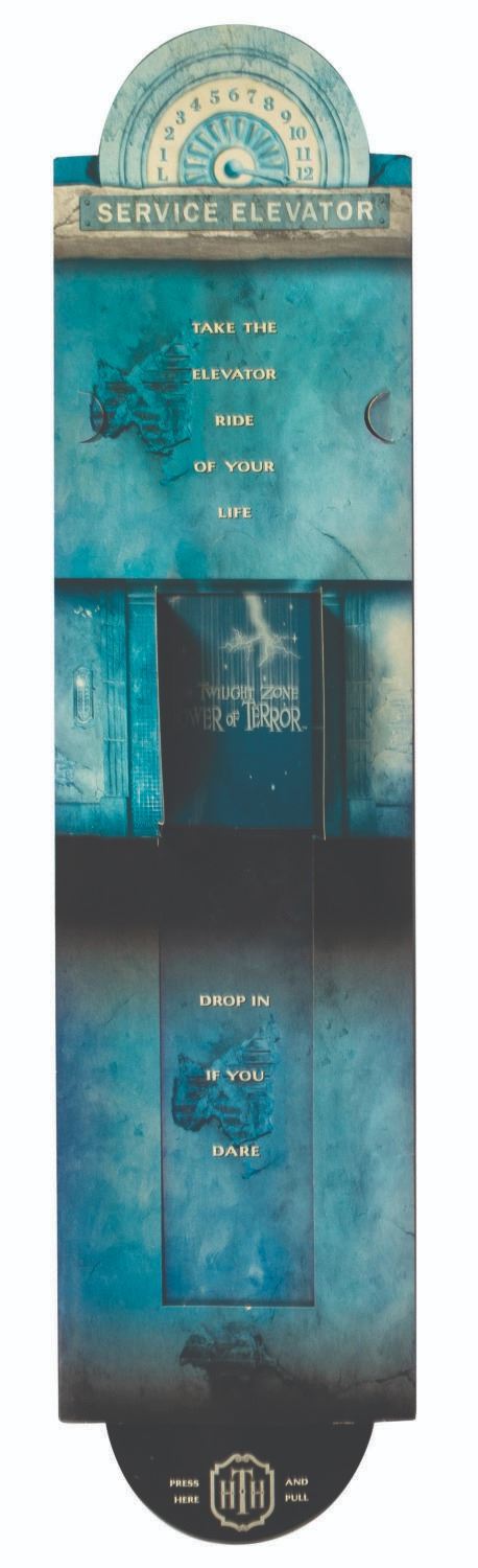 (California Adventure, 2004) An invitation sent to press and VIPs in advance of the grand opening of The Twilight Zone Tower of Terror attraction at California Adventure. Shaped like an elevator shaft, the cardboard invitation features a drop-down window and a functioning audio element that plays the eerie prelude to the thrill ride. Measuring 21"x5", the invitation is in very good condition with minor corner creasing to the fold-out elevator doors and edge wear. The original transmittal envelope is included.