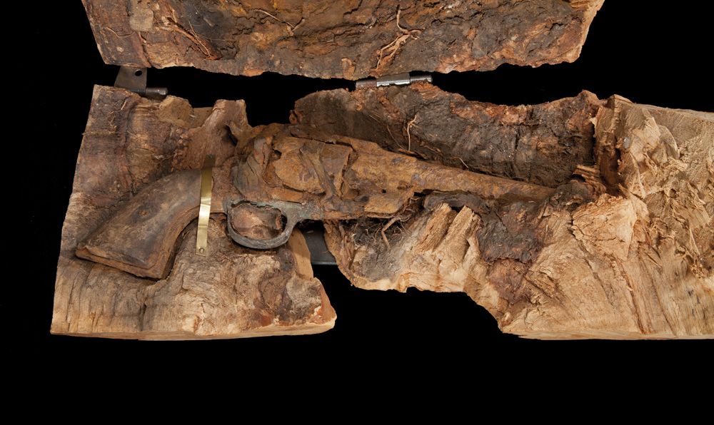 Surviving many years in the ground until a tree grew around it, this Remington New Model 1858 remained locked away until a modern chainsaw came along and un-treed this treasure. 19” tall by 15” open, the wood shows the natural split up the trunk that would reveal the percussion revolver. Stabilized with braces on the outside and fitted with metal hinges to make a great display. There are unsubstantiated stories of where it was found, but we like the one about The Hole in the Wall in Wyoming.
