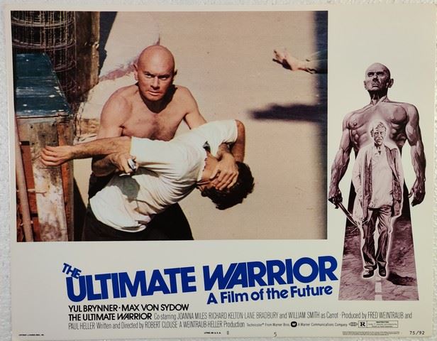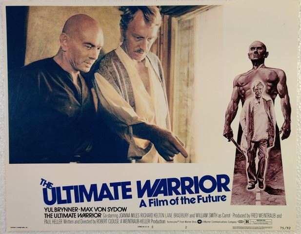 The Ultimate Warrior (Warner Bros., 1975) lobby card. Sci-Fi, Action. Starring Yul Brynner, Max von Sydow, Joanna Miles, William Smith, Richard Kelton, Stephen McHattie, Darrel Zwerling, Lane Bradbury, Nate Esformes, Mel Novak, Mickey Caruso, Gary Johnson. Directed by Robert Clouse. Very minor edge wear. Near Mint. (11"x14").