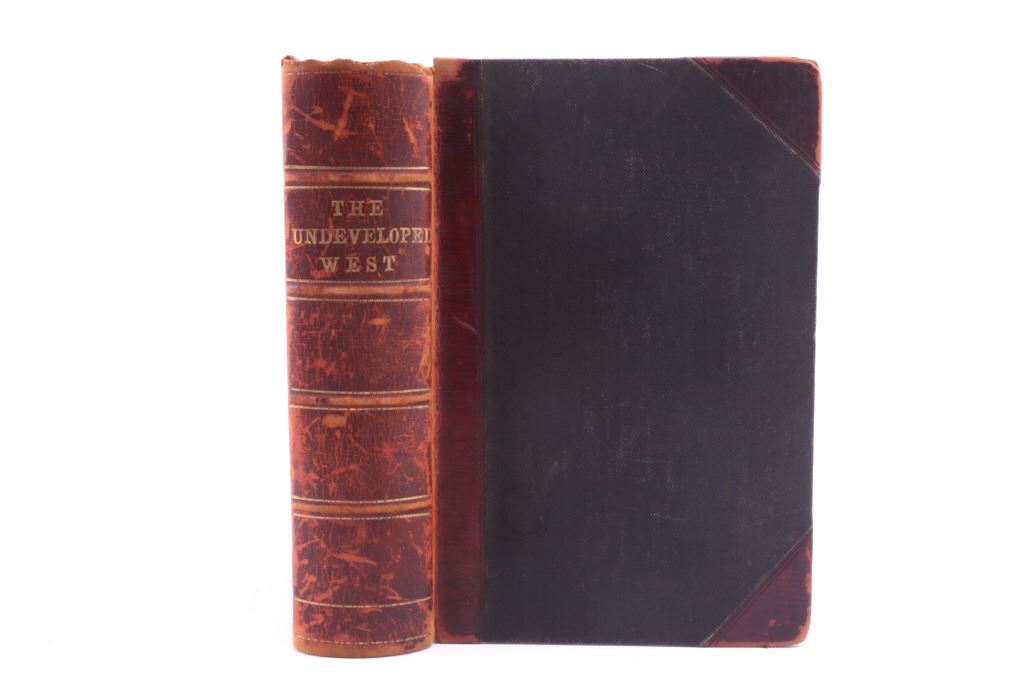 Featured in this lot is this 1873 first edition of “The Undeveloped West” or “Five Years in the Territories: A complete history of that vast region between the Mississippi and the Pacific, its resources, climate, inhabitants, natural curiosities, Etc., Etc.” The book is bound in red leather and black linen with gold gilt on the spine. The condition of this book is fair, with wear and slight browning to the pages consistent with the age of the book. The measurements of this book are 8 1/2" x 6".