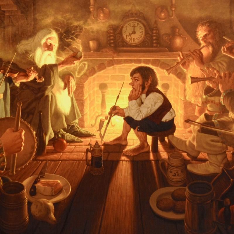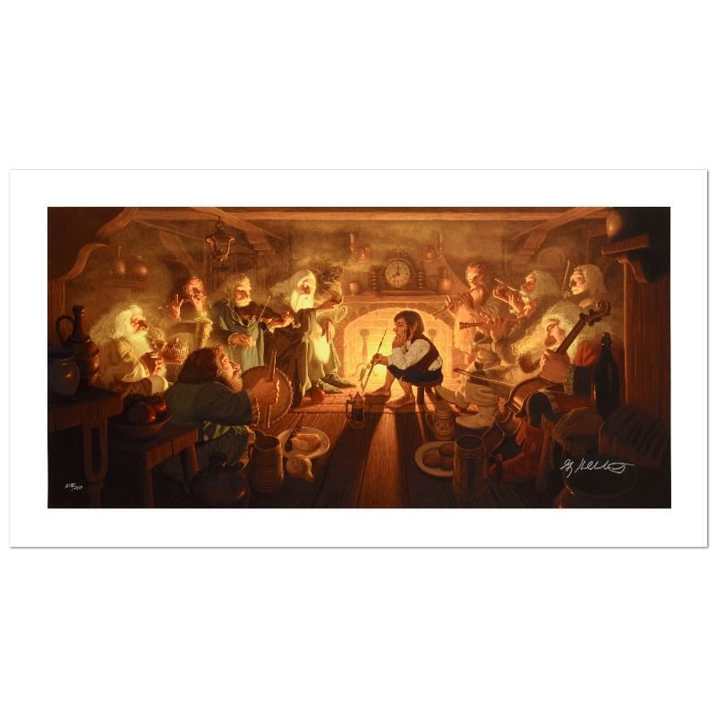 Known world wide for their fantasy and science fiction illustrations, identical twin brothers Greg and Tim Hildebrandt created an abundance of fascinating artwork, most notably their illustration work for J.R.R. Tolkien's 'The Hobbit' and 'Lord of the Rings'. "The Unexpected Party", originally created in the 1970's for Ballantine Books, is a limited edition giclee on canvas, numbered and hand signed by Greg Hildebrandt! Includes Certificate of Authenticity! Measures approx. 35" x 17" (image).