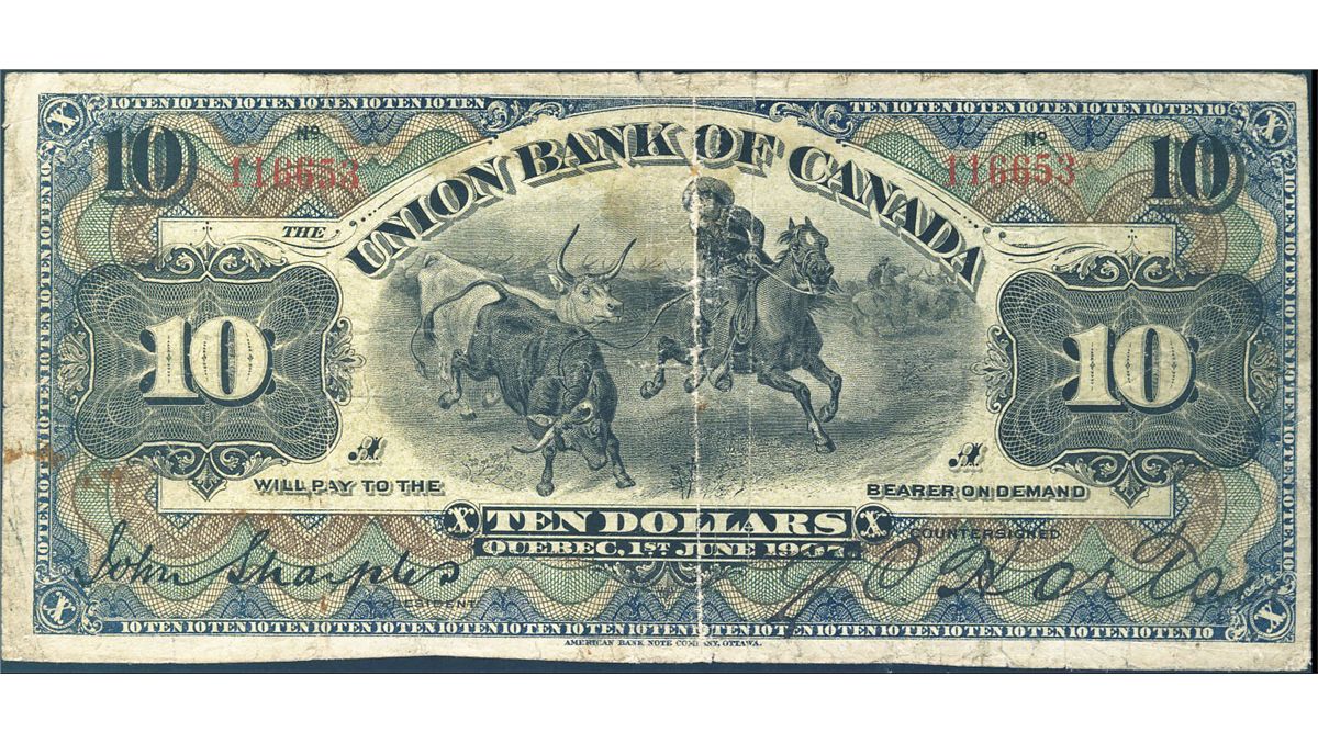 The Union Bank of Canada; 1907 $10 #116653 CH-730-14-08 PMG VG10. Very scarce issue.