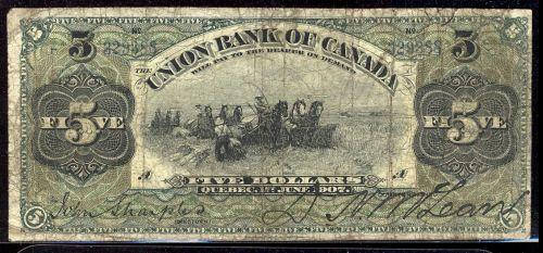 The Union Bank of Canada 1907 $5 "QUEBEC" issue. 329388, VG nicks.