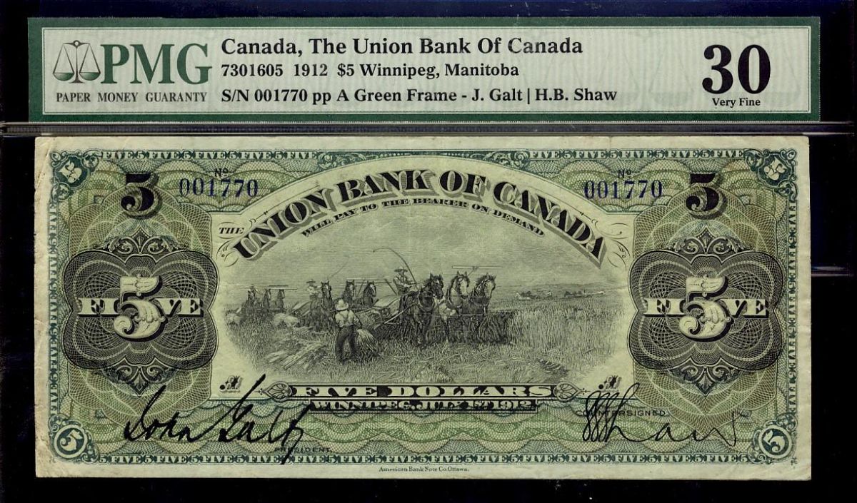 The Union Bank of Canada 1912 $5 #001770 CH-730-16-06 PMG VF30.