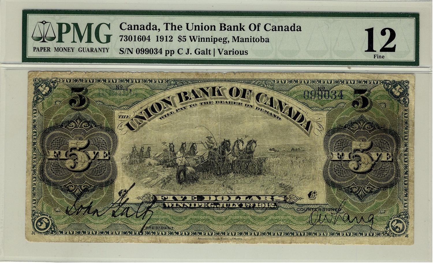 The Union Bank of Canada, 1912 $5 #099034, CH-730-16-04, PMG F12.