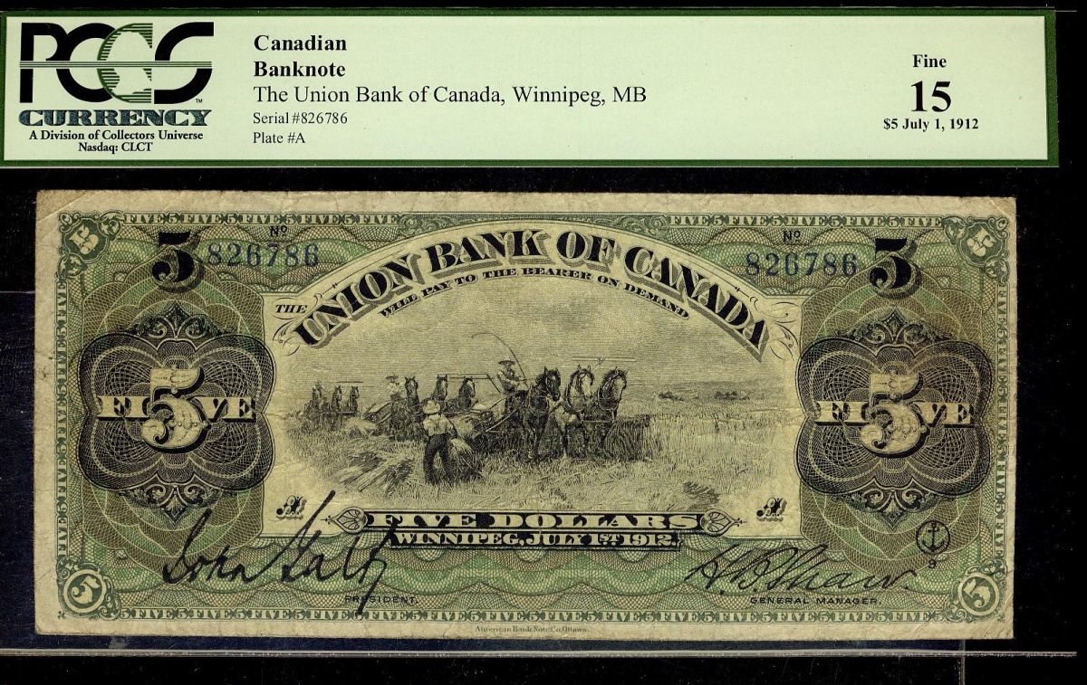 The Union Bank of Canada 1912 $5 #826786 CH-730-16-06 PMG F15. A popular issue.
