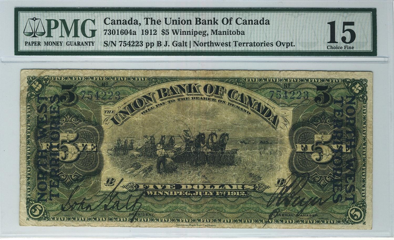 The Union Bank of Canada 1912 $5 CH-730-16-06a OVER STAMPED NORTH WEST TERRITORIES. 754223 PMG F15. Excessively rare, very few examples are known.