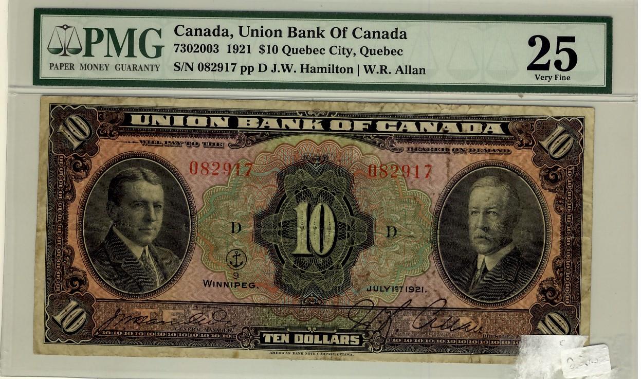 The Union Bank of Canada 1921 $10 082917 CH 730-20-03 PMG VF25. Very scarce signature. Only a few examples known.