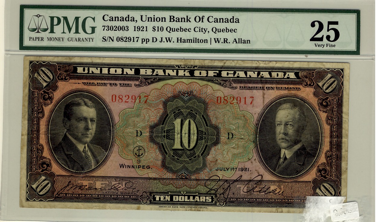 The Union Bank of Canada 1921 $10 082917 CH 730-20-03 PMG VF25. Very scarce signature. Only a few examples known.
