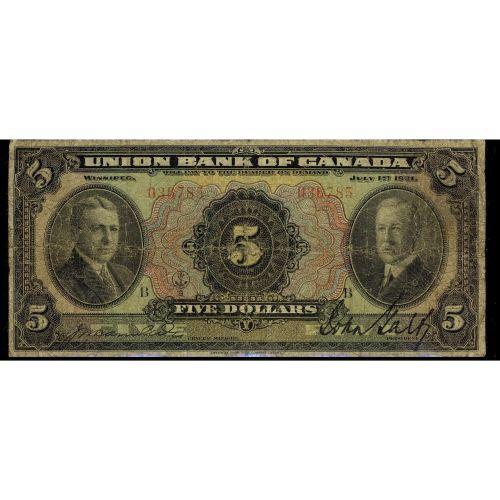The Union Bank of Canada 1921 $5 #036785 Ch-730-20-02 VG-F. Scarce