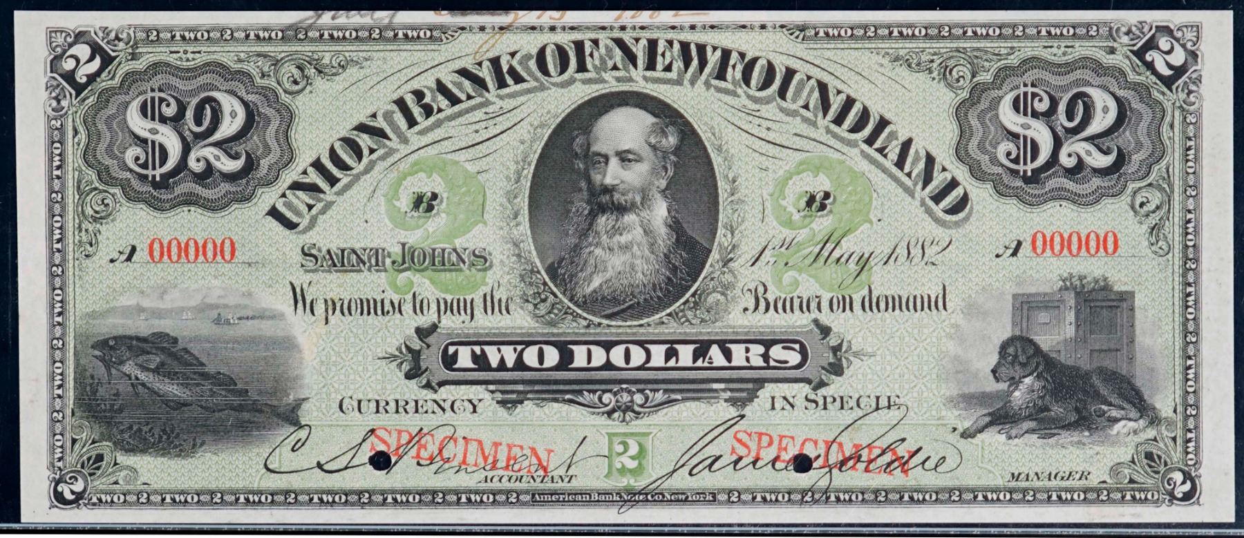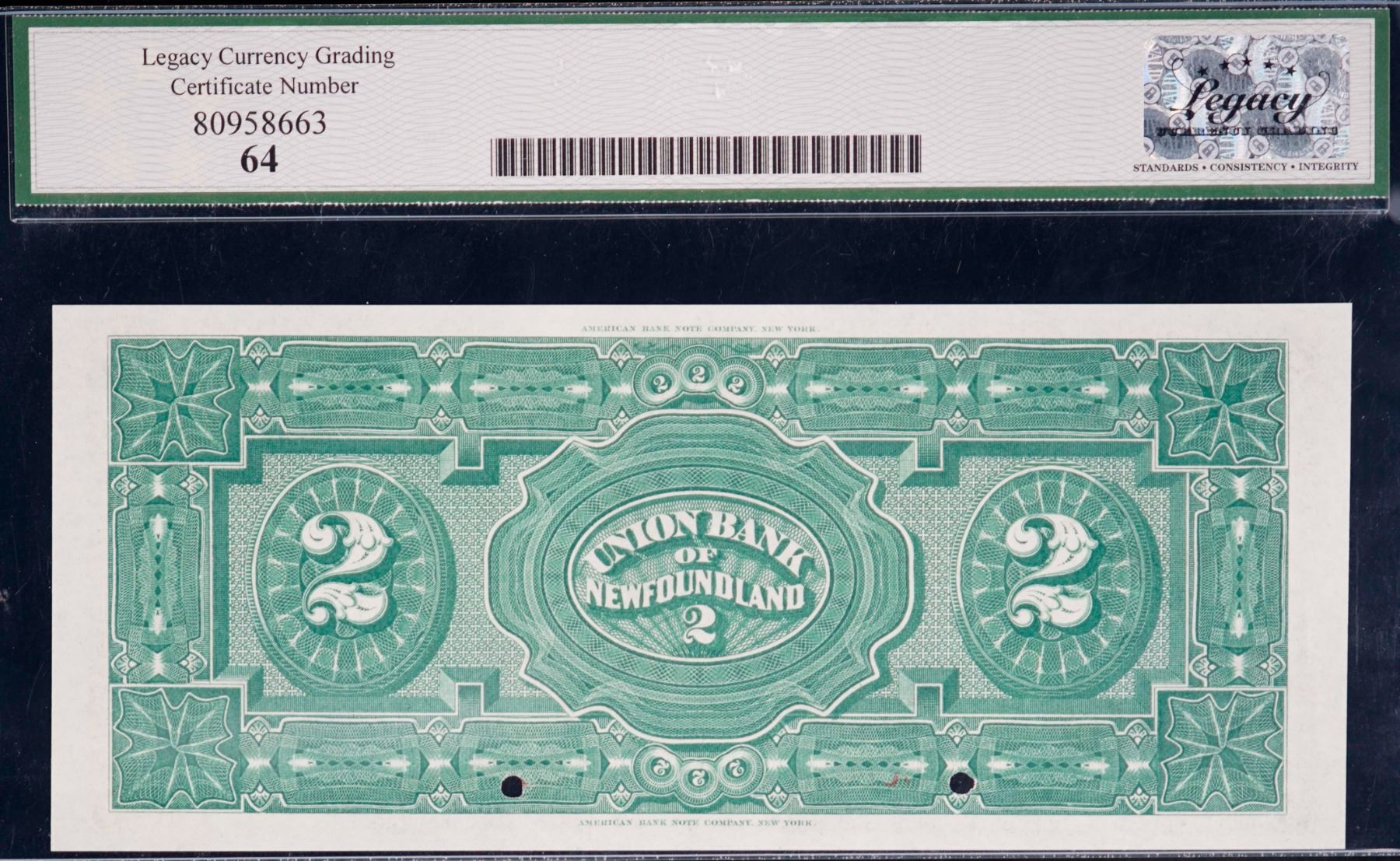 The Union Bank of Newfoundland; 1882 $2 CH-750-16-02S, Legacy Choice Uncirculated-64 Hole Punch Cancelled. This is a pristine issue with great eye appeal, good margins and superb embossing.