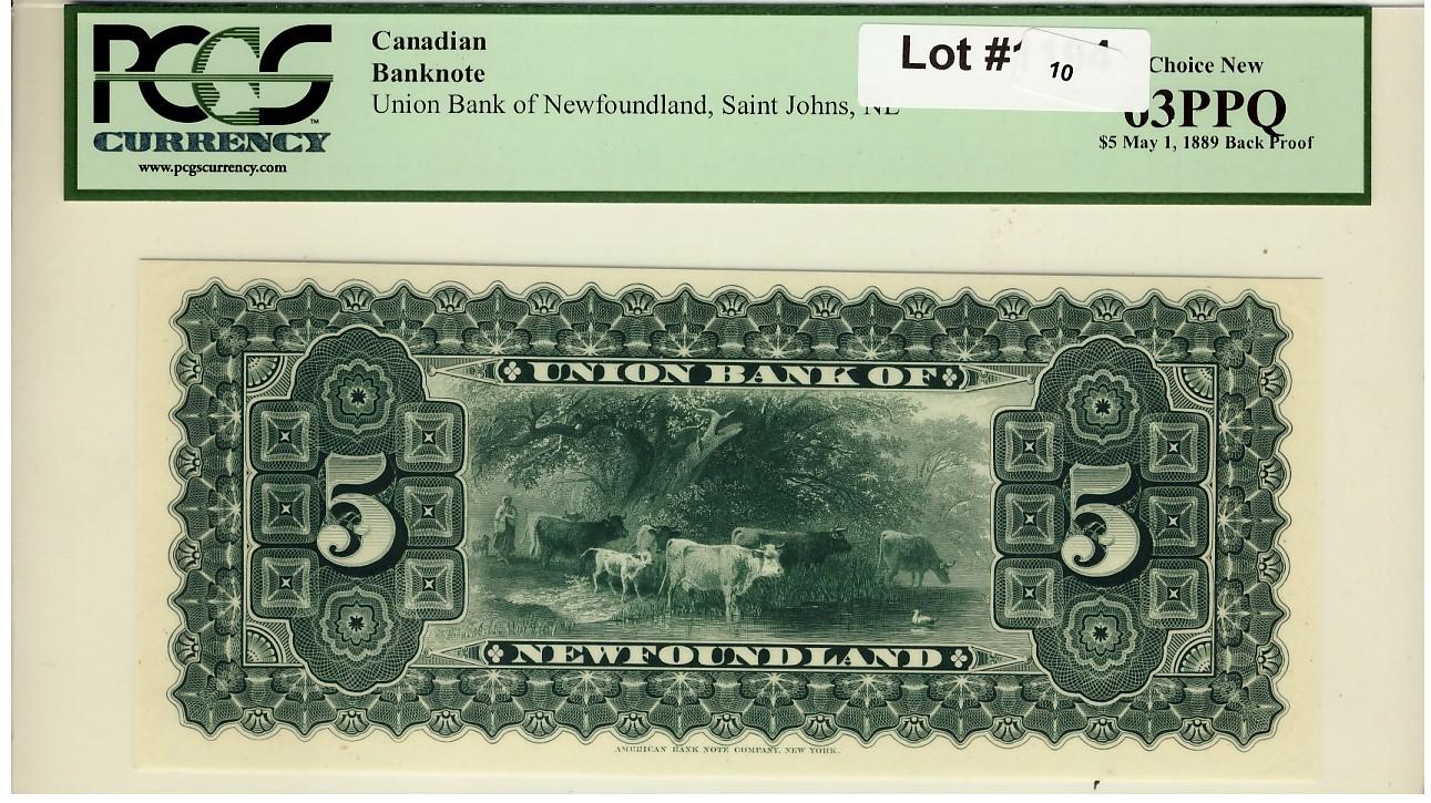The Union Bank of Newfoundland, 1889 $5 BackProof CH-750-16-04s, PCGS CH UNC63PPQ.