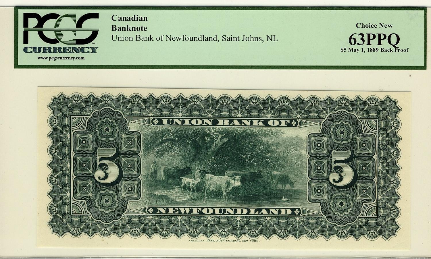 The Union Bank of Newfoundland, 1889 $5 BackProof CH-750-16-04s, PCGS CH UNC63PPQ.