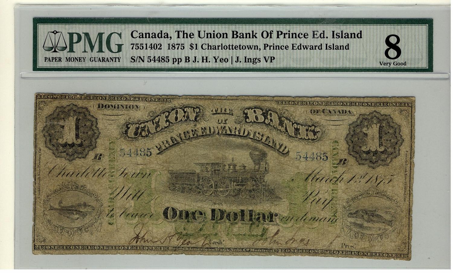 The Union Bank of Prince Edward Island, 1875 $1 #54485, CH-755-14-02, PMG VG8. Only 8 known. Very rare.
