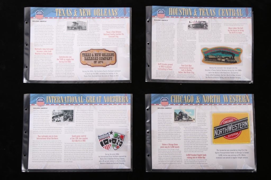 For your bidding pleasure is this The Union Pacific Railroad Patch Collection. The Union Pacific Railroad operates as a premier railroad in North America, operating in 23 states in the western two-thirds of the United States. Hauling frieght and operating 8,500 locomotives over 32,100 route-miles west of Chicago and New Orleans, the Union Pacific railroad is the second largest railroad system in the United States and is one of the worlds largest transportation companies. This binder of collected patches is in excellent display condition and a great addition to any collectors inventory of American history. This binder shows excellent information on all associated stations and stops corresponding to the patch that belongs to those specific stops. There are forty Patches in total and eighty pages of information in total. The measurements of the binder are 9 3/4" x 16 1/8" x 4".