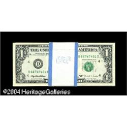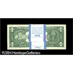 The United States Botanic Garden Coinage and Currency S <B>Fr. 1923-D $1 1995 Federal Reserve Web Notes. Original Pack of 100. Gem Crisp Uncirculated.</B></I><BR>These notes from the ill-fated web printing experiment carry the 2/9 plate combination and are from run 1.<BR> 100 notes <BR><BR><B>Important notice:</B> Heritage usually auctions material at the rate of 200-250 lots per hour. On some occasions eBay Live bid software or the Internet may not be able to keep up with the pace of the auction. We recommend placing a realistic absentee bid now as insurance to avoid disappointment. Occasionally the auctioneer may eliminate or reject an eBay Live bid, and the auctioneer may also reopen a lot after the close of the eBay live bidding (usually because we missed an audience bid), and may reject your bid even if it shows you as the winning bidder. By bidding via eBay Live, you agree that Heritage may award the lot to another bidder at its sole discretion under the circumstances described above or any other reasonable circumstances. Since eBay bids are not shown to us until we open the lot on the floor, we treat those bids just like floor bids. In most cases the floor responds before the eBay bid is presented to us, due to Internet lag time, so for consistency we have made it a policy that floor bids are always considered first over tie eBay live bids. Also please note that all Heritage lots purchased through eBay Live carry a 20% Buyer's Premium. Please make sure you read the Terms and Conditions before you bid. This lot is being auctioned in conjunction with a live floor auction by Heritage Galleries & Auctioneers. All final auction and invoice information will be supplied by Heritage Galleries & Auctioneers, and all other information should be considered preliminary. Lot:16327