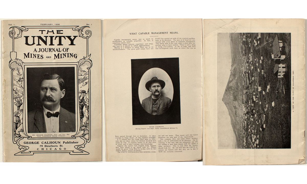 This is a February 1906 prospectus in the form of a magazine. George Calhoun was the publisher and the president and general manager of the Unity Consolidated Mining Company. 14 photographs of the people involved and the mining area. One map and one copy of an assay report. 32 pages. Volume 1 of the Mines Directory states it has 30 acres of unpatented claims. Certainly one of the most compelling prospectus. Fold down the middle.