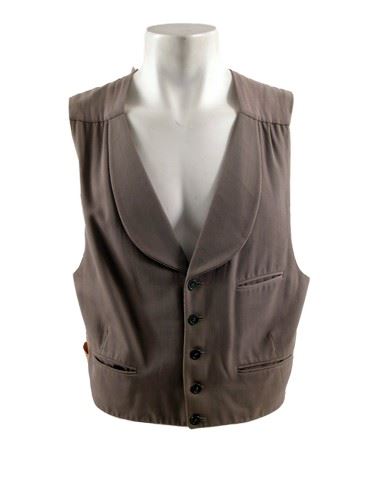 From Special Agent Eliot Ness and his elite team of agents comes The Untouchables TV Series (1959–1963) and this is Eliot Ness's (Robert Stack) production acquired and used light brown five button belted vest. The belt is on the back vest and there is a Western Costume Company tag on the inside of the back of the vest.