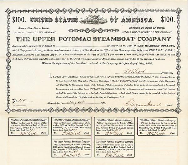 1875, Virginia. $100 bond bearing 8% interest. Black. Small vignette of a side-wheeler at top center. Coupons attached at bottom. Ornate border. Uncancelled and Excellent