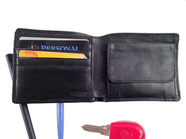 Dell (Kevin Hart) screen used, hero, wallet with a red key and a check from lunch, two ink pens, wallet includes a credit cards and some change it also has a rolling paper with the word "exhile" written on it.(13x11)