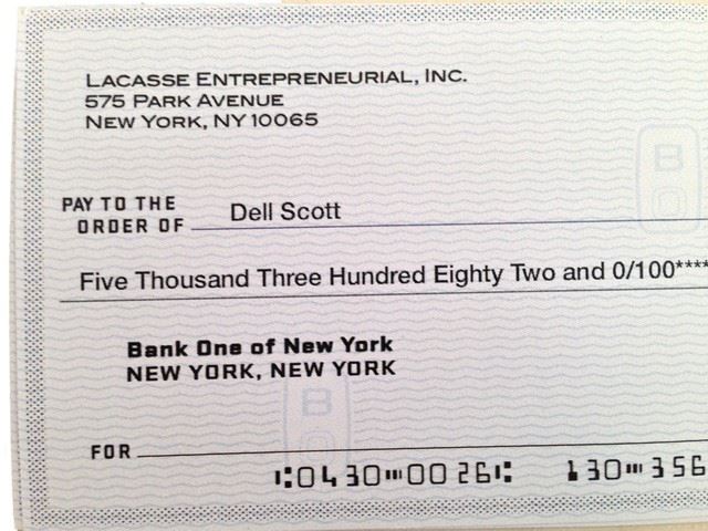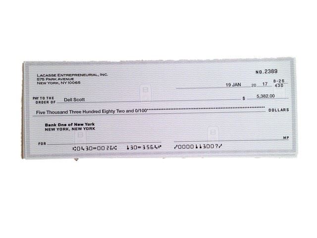 Dell (Kevin Hart) screen used, hero, first paycheck for $5,382 from Lacasse Entrepreneurial Inc.. Check # 2389. Paycheck is unsigned given to Dell (Kevin Hart) by Yvonne (Nicole Kidman) in the film.