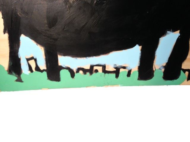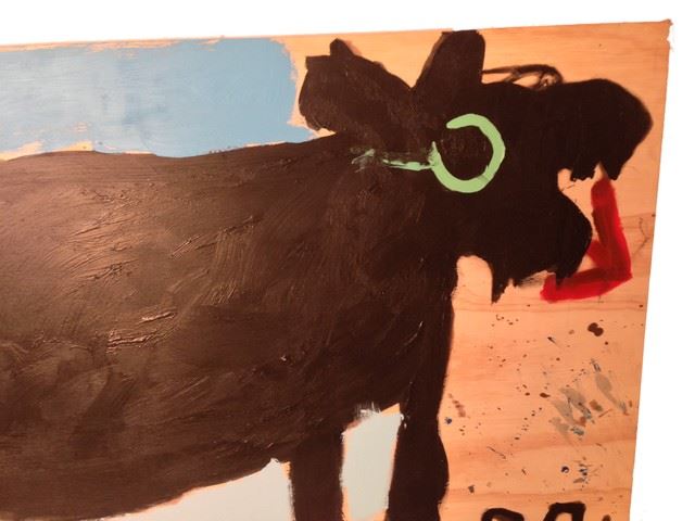 Screen used, hero, large painting on a wood board. Painting is of a black dog with a green eye and red close to the mouth, because it’s the beginning stage of this painting the painting itself is unfinished, there is only some green at the bottom of the feet and blue under the legs and on top.(58x37)