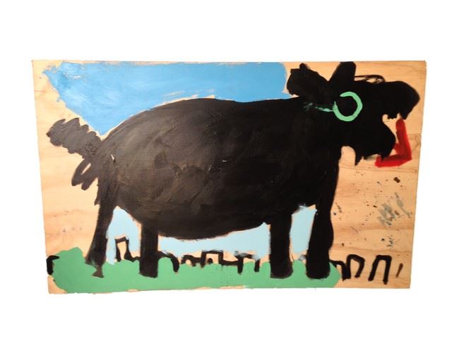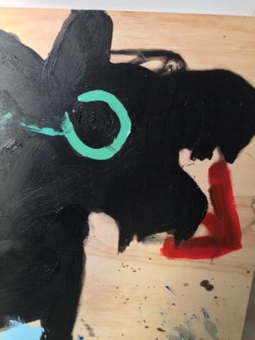 Screen used, hero, large painting on a wood board. Painting is of a black dog with a green eye and red close to the mouth, because it’s the beginning stage of this painting the painting itself is unfinished, there is only some green at the bottom of the feet and blue under the legs and on top.(58x37)