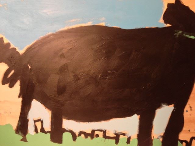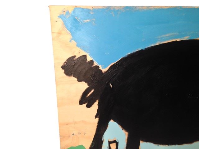 Screen used, hero, large painting on a wood board. Painting is of a black dog with a green eye and red close to the mouth, because it’s the beginning stage of this painting the painting itself is unfinished, there is only some green at the bottom of the feet and blue under the legs and on top.(58x37)