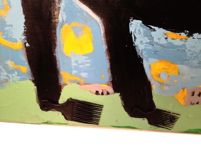 Screen used, hero, final stage, large painting on a wood board. Painting is of a black dog with real hair combs for teeth and claws,. Thumb tacks and cardboard are painted in on the dogs belly for a textured look. Background is bright color of a city and buildings. The word love is written on the left side of the painting.(58x37)