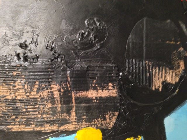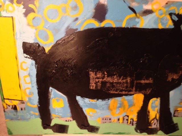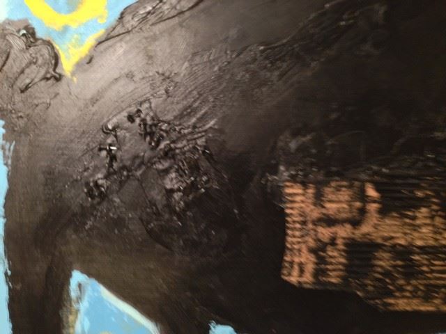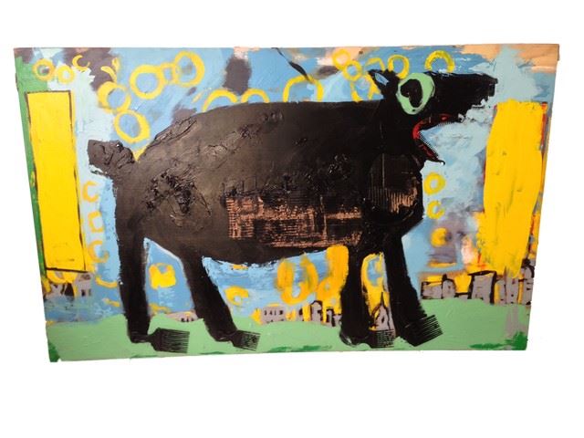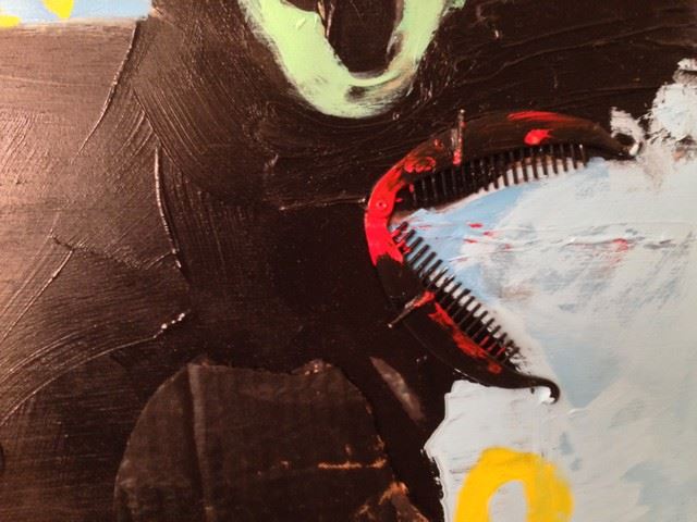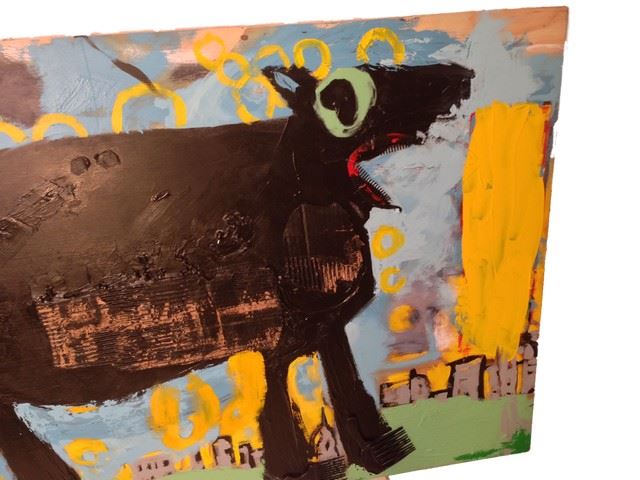 Screen used, hero, final stage, large painting on a wood board. Painting is of a black dog with real hair combs for teeth and claws,. Thumb tacks and cardboard are painted in on the dogs belly for a textured look. Background is bright color of a city and buildings. The word love is written on the left side of the painting.(58x37)